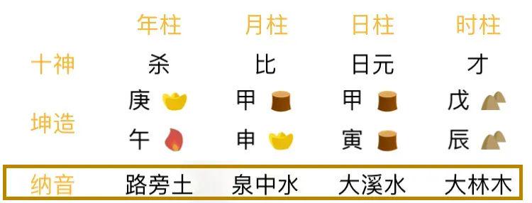 比如:庚午年=路旁土年、甲申月=泉中水月、甲寅日=大溪水日、戊辰时=大林木时、丙寅大运=炉中火大运……