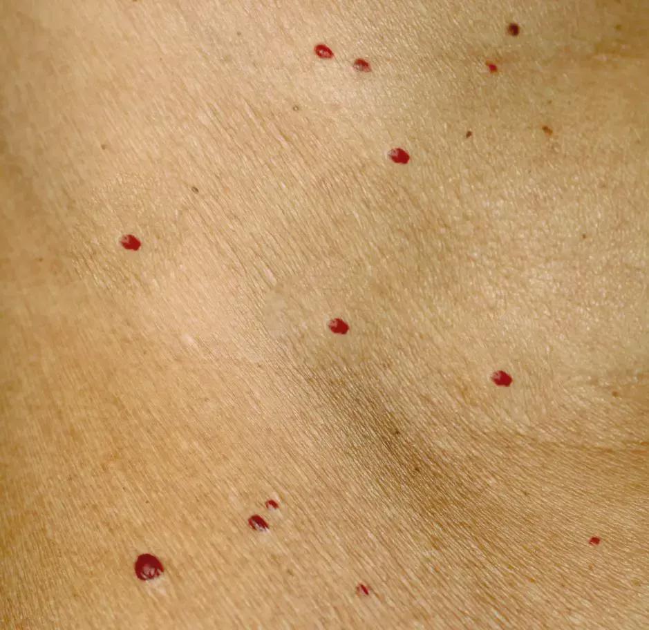 还有一个值得说的一个现象,是皮肤长红痣,也就是散在的小红点,就像下图这样。