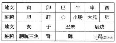 丑未为脾,辰戌为胃,子为膀胱、三焦,寅为胆,卯为肝,巳为心,午为小肠,申为大肠,酉为肺,亥为肾、心包(见表)
