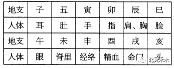 十二支配身体:子为耳,丑为肚,寅为手,卯为指,辰为肩、胸,巳为脸、咽、齿,午为眼,未为脊梁,申为经络,酉为精血,戌为命门,亥为头(见表)