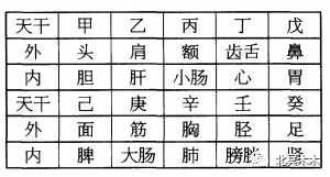 十干配内五行:甲为胆,乙为肝,丙为小肠,丁为心,戊为胃,己为脾,庚为大肠,辛为肺,壬为膀胱,癸为肾(见表)