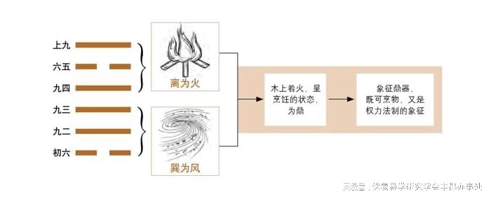 这个卦是异卦(下巽上离)相叠。燃木煮食,化生为熟,除旧布新的意思。鼎为重宝大器,三足稳重之象。煮食,喻食物充足,不再有困难和困扰。在此基础上宜变革,发展事业。