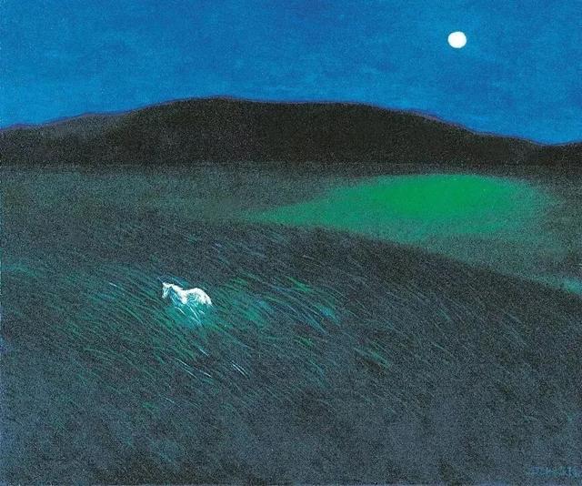 席慕蓉的油画《月光下的白马》,1993年。