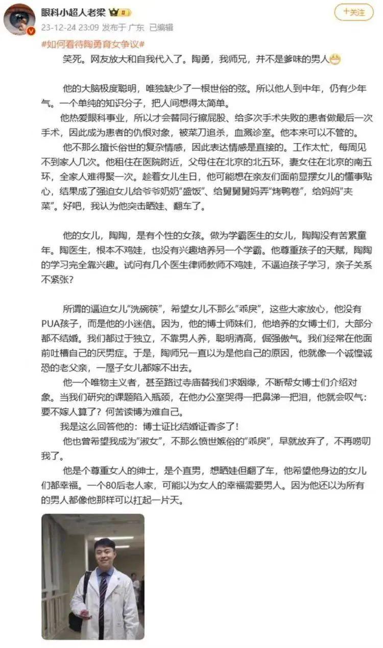 谁也没想到,此前因患者暴力伤医而为大家所知的“眼科医生陶勇”,居然因为自己的家庭教育观念出圈了。