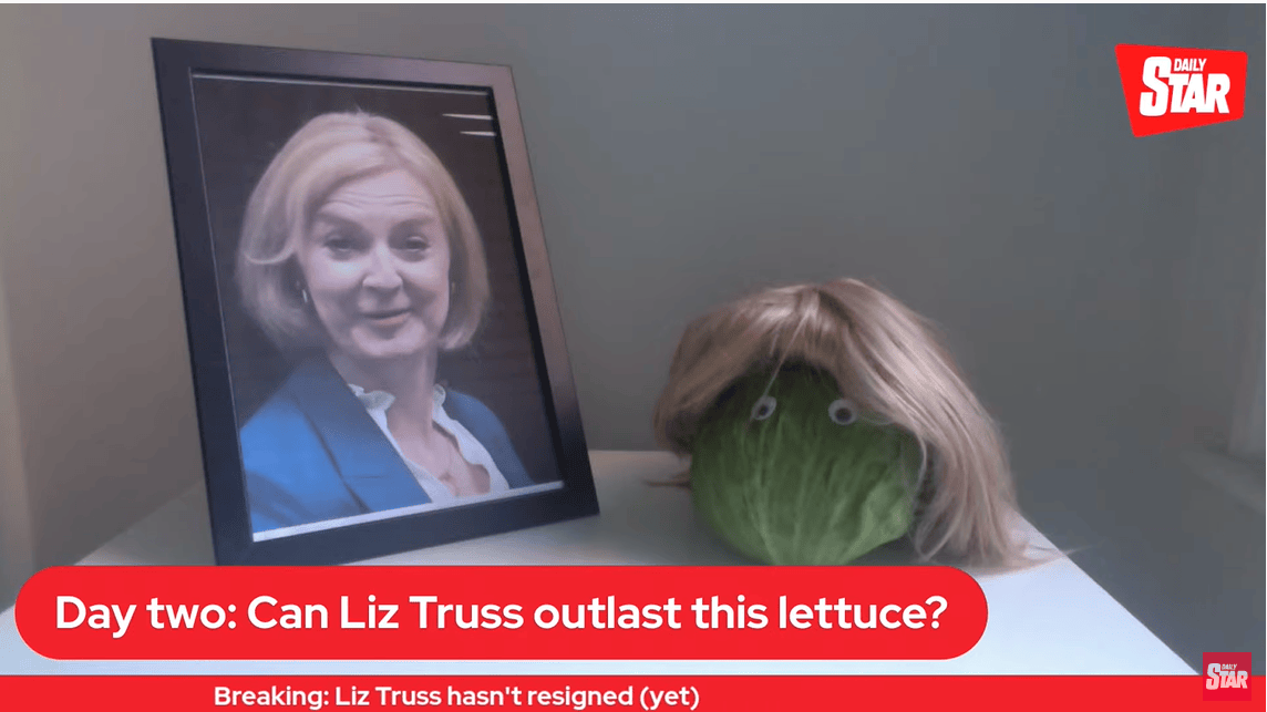 特拉斯和生菜的梗源于她首相任期的最后几日,当时英国小报《每日星报》直播了一场比赛,看看是在乐购花60便士(折合人民币约为4.4元)买的球生菜先腐烂还是特拉斯先离开唐宁街10号,以此来嘲讽特拉斯执政不足一个月就把英国弄得乌烟瘴气,她的任期恐怕比生菜的保质期还短。