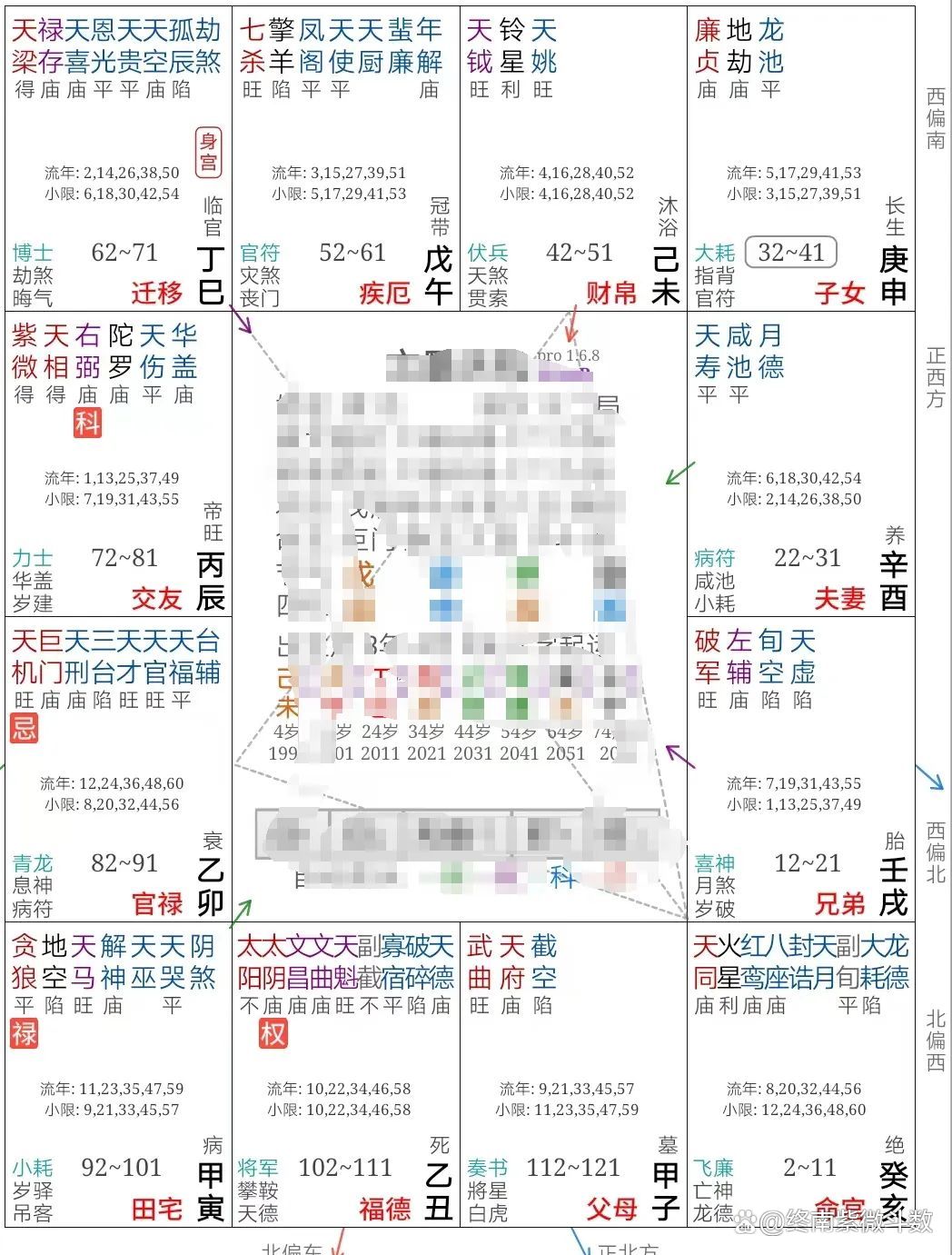 大运命迁线所得:生年忌自化禄视同自化禄,相当于三忌汇聚,这条线尤其要注意交通安全的问题,那到底会不会出问题?还要看大疾。大疾坐生年科,这是好象,尤其对平安健康而言,能够解厄制化。问题是,大疾权入大迁逢生年忌冲大命,权忌就是来得快去的急,天机是小汽车,这个时候的出行安全就要慎之又慎。而且大子同样天机冲大命,就是很强烈的象。所幸有生年科和双禄的加持,大奴生年禄,因此人是生命无忧,能活下来,但是这个腿脚的伤害就定要小心。那个流年、流月、流日,最好在家不动,或者即使出行,选择最稳妥的公共交通,越安全越好。