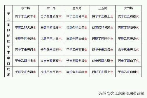 甲子乙丑海中金,丙寅丁卯炉中火,戊辰己巳大林木,庚午辛未路旁土,壬申癸酉剑锋金。(下同)