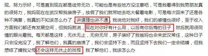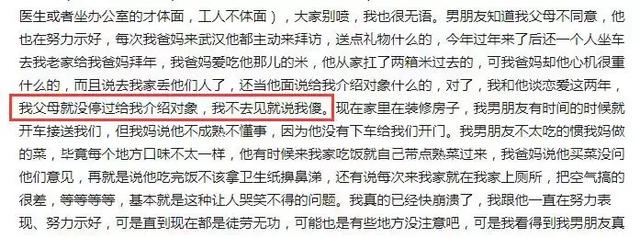知道她父母不同意,男友万般讨好,主动拜访、送礼,一个人坐车去她老家给她爸妈拜年。她的父母始终不为所动,不管男友做什么都挑刺儿,甚至不停地给她介绍对象。