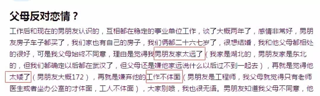他家太远了。他太矮了。他的工作太不体面了。事实是,她家在湖北,男友家在东北。尽管两人确定在武汉定居,她父母还是嫌弃。男友身高 172 cm,是工程师,坦白讲,工作不错。但父母觉得,只有老师、医生这些职业才体面。