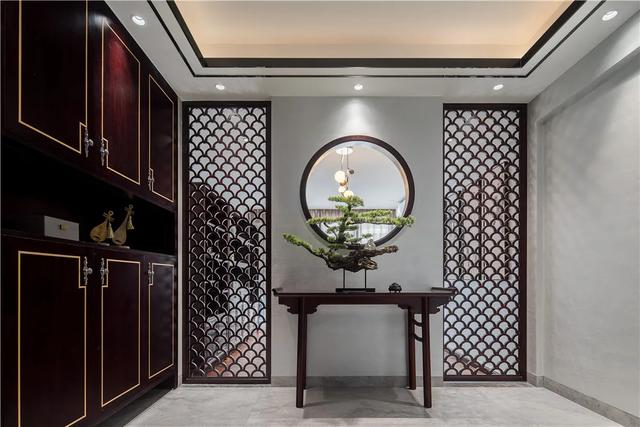 入户,当面实木隔断门障之,似可笼烟筛月,窈然静深。外设条案,上立迎客松、明代钵式炉各一,小而俱雅。左设满墙鞋柜,又置一清代青花绣墩于门右,以供佳客更置鞋履。