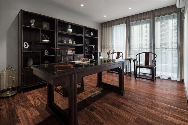书房采用半开放式布局,拾级而下,中正平和的书房稳重自然,遵循古礼的家具成序摆放,端庄大气,中国画的点缀代表了团圆与喜悦,山水之间搭配着饰品更凸显家居的柔美线条,交织出一幅阖家相聚的幸福画卷。搭配满墙书柜与青花瓷花瓶,简约有致,颇有大家风范,精致的灯饰与苍劲的笔锋相互映衬,一柔一刚,不同的材质和质感在空间中相互流动。收藏的珍贵摆设,更显空间的宁静感与雅致感。
