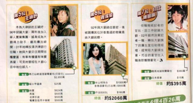 同样是送房,刘銮雄送其他女人的基本都是一两千万的房子,一两百万的车,到甘比这里就是三百万的房子,十几万的车,跟普通有钱人包二奶一个价位了。