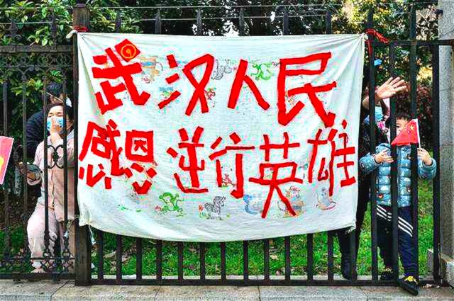 读图:市民们拉起手写横幅,敲起锅碗瓢盆,站在阳台上,隔着围栏挥泪送别一支又一支援鄂医疗队,“谢谢你,为湖北拼过命”。