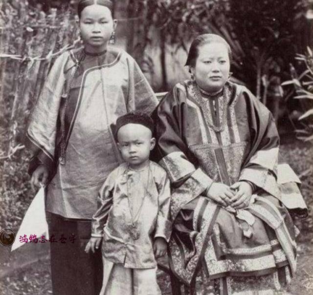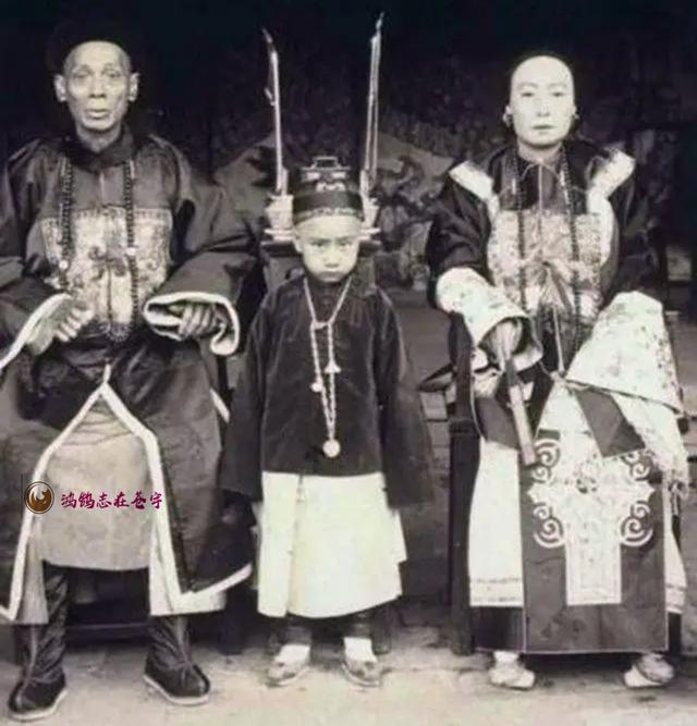 一张朝廷官员的全家福,老来得子,宝贝儿子挂着长命锁,金光闪闪。夫妻俩虽然年龄有差距,在当时却稀松平常。