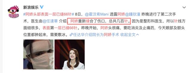在9月7日晚,阿娇进行了第二次手术,重新缝合了伤口,表面第一层就缝了66针,一场手术总共缝了几百针。