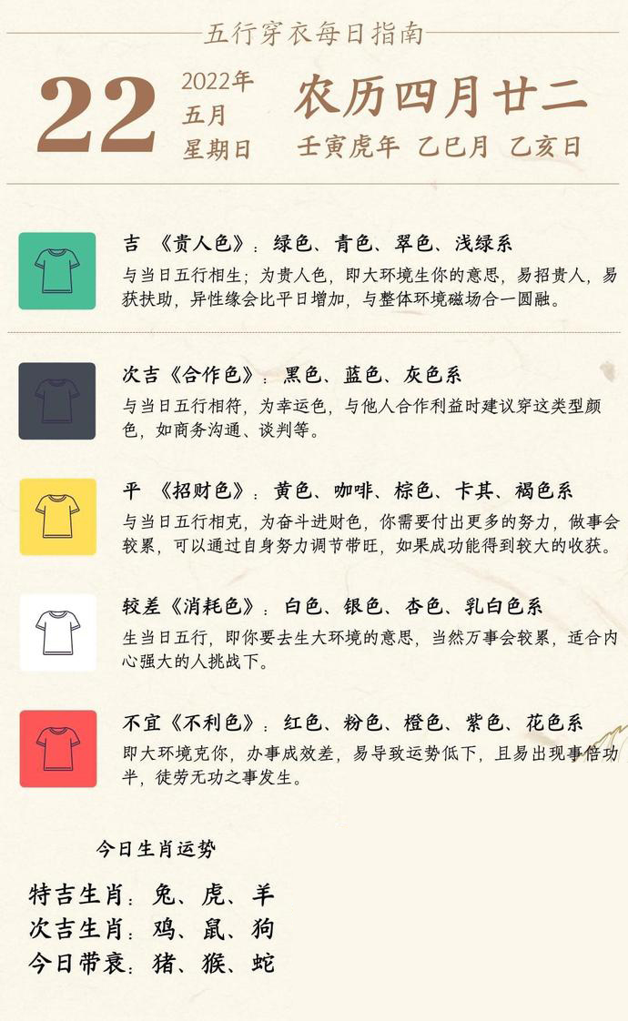 2022年5月22日民俗老黄历,星期日,民俗老黄历农历四月二十二号,乙亥日。民俗老黄历本日为破日,为成就、成功、结果之意。凡事皆有成,祈福、入学、开市、嫁娶、求医、远行、搬家、上任都是好日子。但不宜打官司。冲蛇(己巳)煞西,本日对属蛇的朋友不太有利,不宜做重大的事,比如嫁娶、开业等。本日煞神方位在西方,向西方行事要小心。