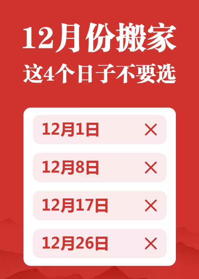 阳历12月份马上到了,如果你计划在12月份搬家,请一定记住这4个日子千万不要选: