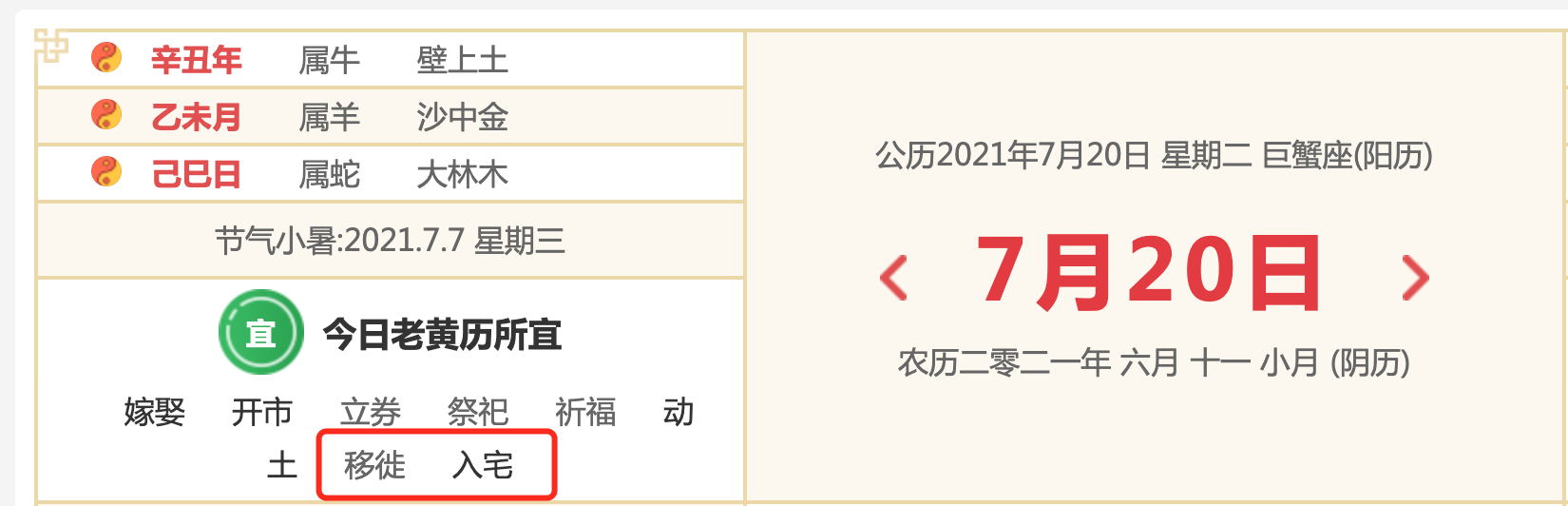 小陈搬家那天是2021年7月20日,从老黄历上看这天虽然宜移徙、宜入宅。