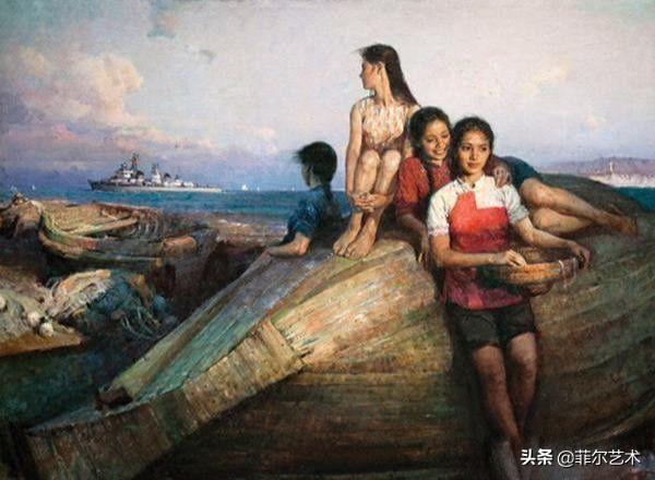 这幅画运用浓重的色彩表现了一个渔家姑娘与某海军战士的爱情故事。画面上四个年轻的渔家女,在絮絮私语,表情恬静、柔美,远处是归来的舰队,令人遥想起渔家女的话题和舰队上的军人相关,整个画面充溢着温馨的爱情意味。画面中心的几个渔家女子,容颜美丽,身材纤细,表情宁静,传递出两个信息:一是作者对美的把握已经超出了写实的范围;二是作者在肖像画上的功力远非一般的画家所比。画面中心的女子,原型就是画家当时的女朋友——广州军区战士歌舞团的演员栾明,栾明后来成了他的太太,也成为他后来很多作品中的模特。何岸(1957-) 广东广州人。父亲何克敌是广东画院著名油画家。