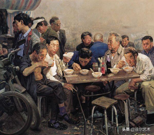 这幅《早点》获第十届全国美展金奖。忻东旺(1963—2014),1963年生于河北省张家口,1980年到内蒙化德县文化馆学画,1981年回乡自学绘画并兼做民间画匠,1986年考取山西晋中师专艺术系,1988年毕业后先后任教于山西大同幼儿师范学校、山西师范大学美术系、天津美术学院油画系、清华大学美术学院绘画系。1991年中国画《惊蛰》获中国第四届美展银奖,1995年水彩画《教授》获首届全国水彩画展铜奖,1995年《回声》获首届油画风景展一等奖,1995年《诚城》获第三届中国油画年展银奖,1999年《远亲》(油画)获第九届全国美展铜奖,2002年《巡视天疆》(合作)获第十届全军美展一等奖。2014年1月11日忻东旺因淋巴癌去世,享年51岁。