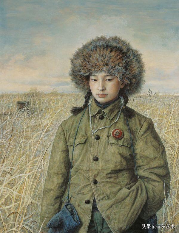 刘孔喜以女性肖像组画格局完成的《青春纪事》,着力刻画一代女知青的特有美感。他用油画记录了一个悲情与浪漫兼有的时代,生活艰苦而世风纯朴,年轻女性的形象成为刻画的重点。作者对道具的刻画写实至极,有着强烈的视觉真实感。刘孔喜(1952-)1969年自北京初中毕业后到黑龙江生产建设兵团参加劳动,其间从事北大荒版画创作。1977年考取沈阳鲁迅美术学院,1982年继续考取该院研究生,1985年毕业获硕士学位,留校任教。1993-1994年,日本国东京武藏野美术大学油画学科客座研究员、研修油画古典技法和坦培拉绘画技法。现任首都师范大学美术学院教授、副院长、硕士研究生导师。