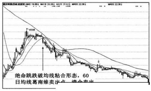 绝命跳的大阴线同时跌破均线粘合形态,后市看跌,卖出。绝命跳的大阴线还是60日均线葛南维第七大法则卖出点,卖出。