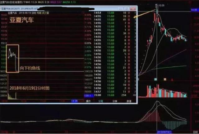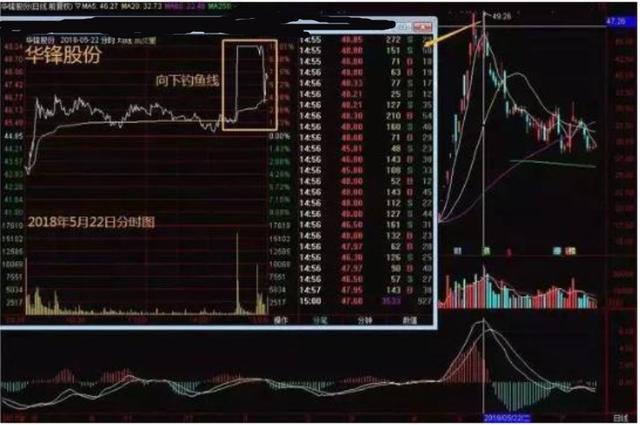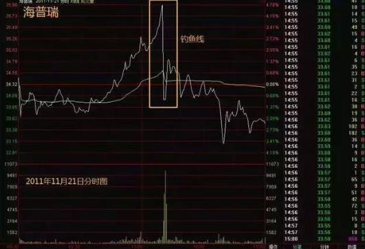 在个股当日即时走势中,主力迅速拉高股价,开始基本保持某一斜率地上行,涨幅超过7%,之后突然直线大幅跳水,主力大单抛货将下方追涨的买盘一网打尽,形成类似一根“鱼杆”及垂钓的“鱼线”的图形。