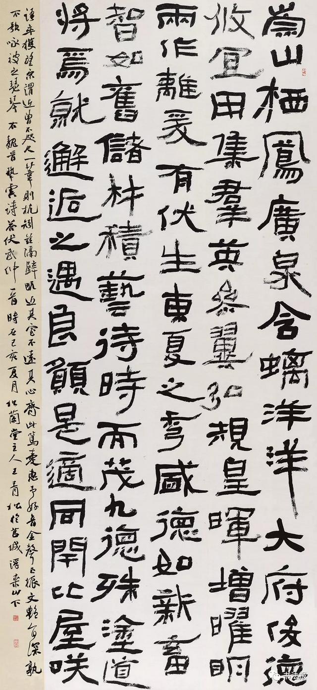 王青松五行大字隶书,两行小行书落款,写得酣畅淋漓,率性自由。章法上这种类于行草的有行无列,其实创作难度很大,一是字内空间与字外空间的平衡关系,一是波画的伸缩关系,处理不好就会相互扞格,抵销张力,予人以刀光剑影之感。此幅作品的优势即在于既能变化又能统一。古人写汉隶,深得明折潜转之妙,故在折时明显呈现棱角,因笔变方向之故。而转时线条连续且略略停顿,暗中转过,连断之间似可分又不可分。青松此作,在这方面似有更大的提升空间。如果在结构重心等细节上更耐人寻味,就更好了。