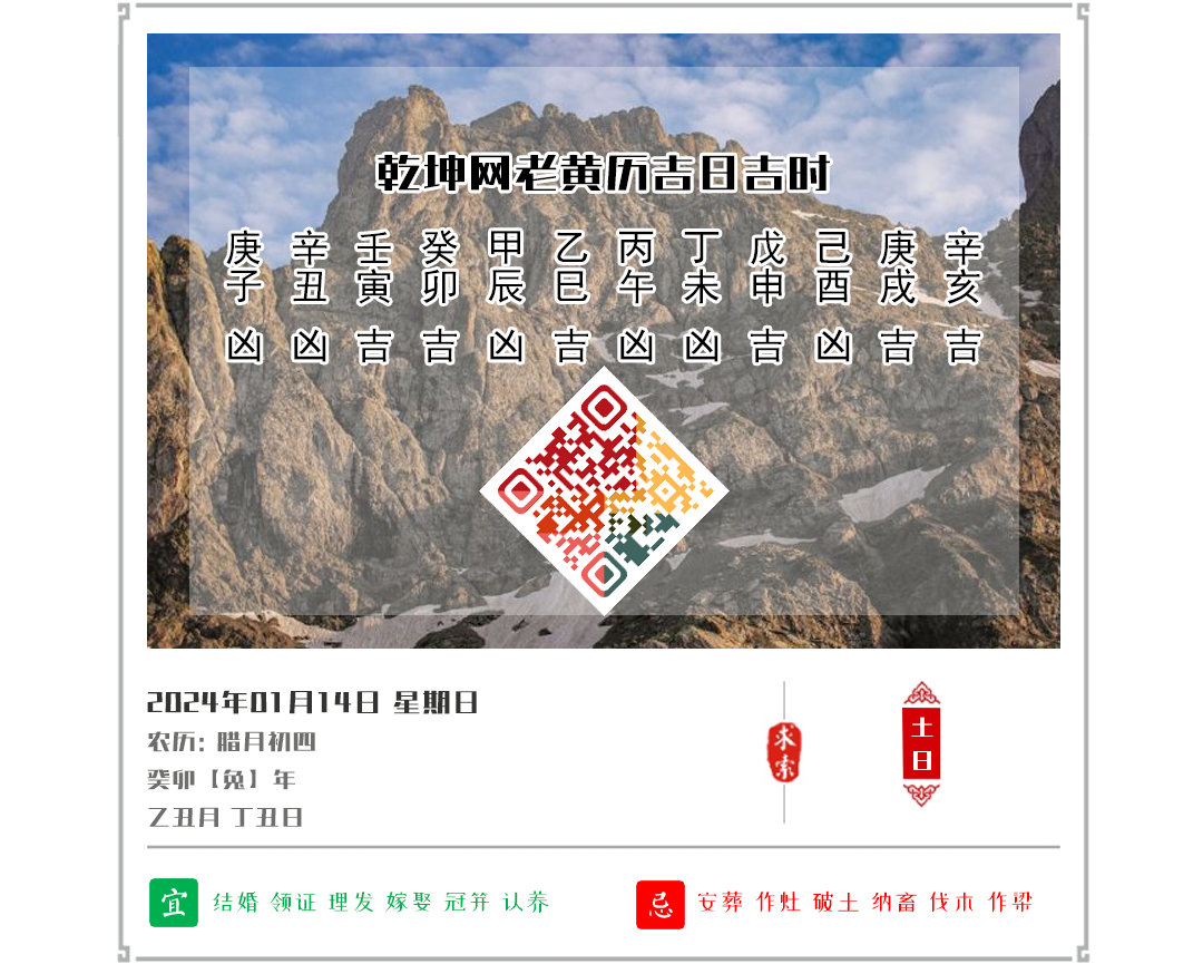2024年1月14日老黄历查询,2024年1月14日老黄历是黄道吉日吗?老黄历,千百年来一直是中华文化的瑰宝,在老黄历中,每一天都有着特定的宜忌活动。2024年1月14日值神是朱雀,是黑道日,不是吉日,不能选择在这天办事。下面,我们就来看一看老黄历的详细内容吧