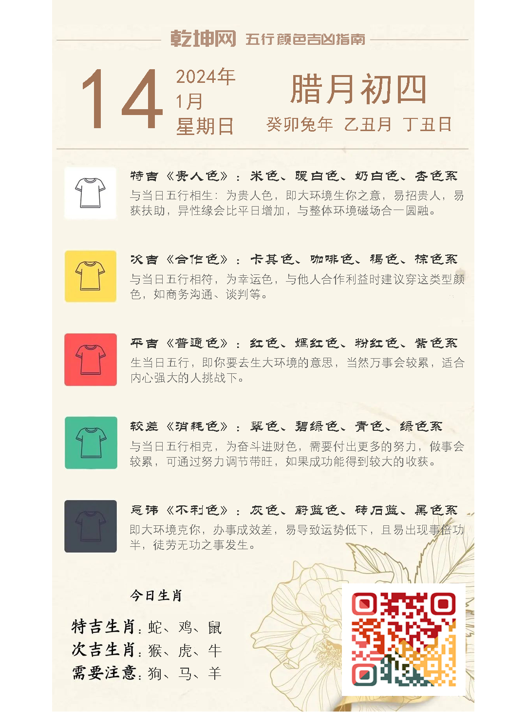 农历:二零二三年 十二月初四,2024年1月14日 星期日,建星:建日,喜神:正南,福神:东南,财神:正西