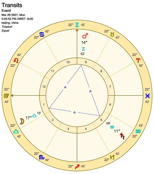 上图中火星、月亮、土星构成一个风元素的大三角格局
