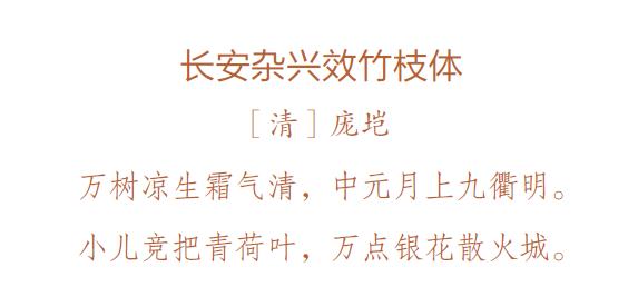 庞垲辞官归乡之后就在家闭门著书,这首《长安杂兴效竹枝体》是庞垲在中元节当天所作。这首诗形象地描绘了中元节的场景,七月十五的晚上已经不似盛夏那样炎热了,开始有些凉意,月亮高高地挂在空中,小孩们纷纷拿着荷叶灯在结伴游玩,灯火照得整个城市像着火了一样。