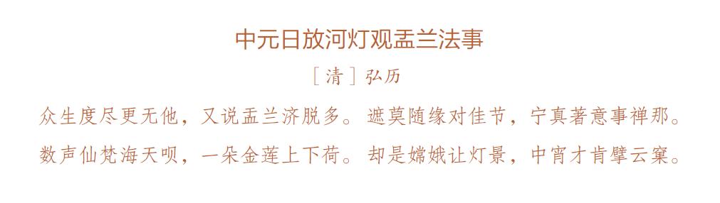 中元节又叫做"盂兰节",这天佛教要举行盛大的仪式,这首诗就写于中元节晚上举行法事的时候。作者看着河里放的荷花一样的灯,想着这佳节盛事会济度多少众生,建多少功德林啊,不禁对这法事多了些敬畏与感慨。