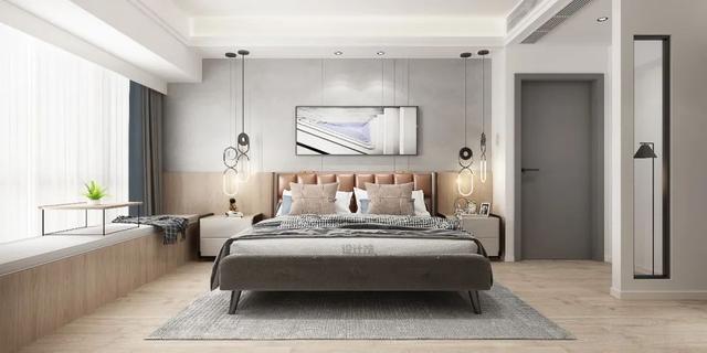 床头墙上用软包或硬包,这样布艺或皮艺的表面材质,用于床头墙上,带来的效果也是非常有温馨自然的质感,能让空间显得更加舒适自然。