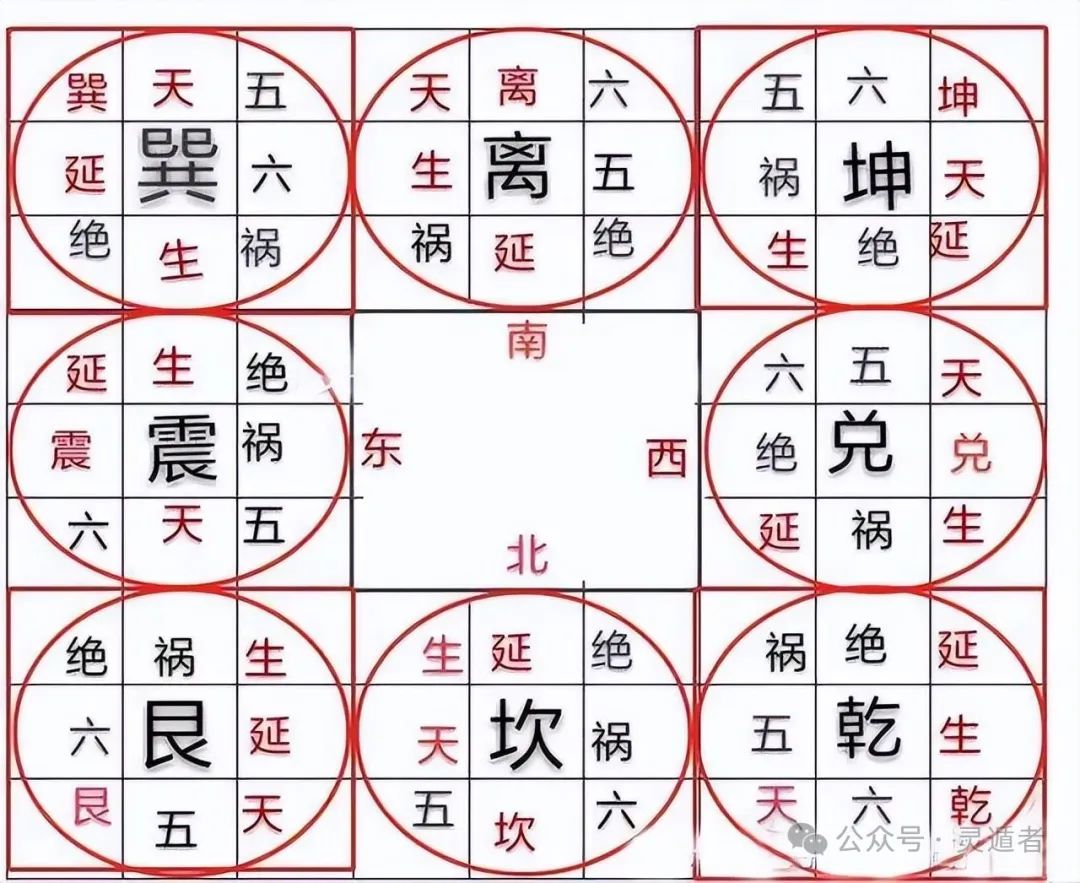 “坎五天生延绝祸六”,意思是说,宅门开于后天八卦方位图中的坎方(北方),或者房主为坎命人,则按照顺时针的顺序,艮方(东北方)为五鬼凶方,震方(东方)天医吉方,巽方(东南方)为生气吉方,离方(南方)为延年吉方,坤方(西南方)为绝命凶方,兑方(西方)为祸害凶方,乾方(西北方)为六煞凶方;伏位,则位于坎方(北方)。其他的口诀如此理解即可。