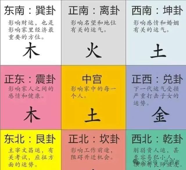 例如,大门向西,则家宅坐东向西;大门向东南,则家宅坐西北。这八个方位分别对应八种卦象,分别是乾、坎、艮、震、巽、离、坤、兑。一个家宅的坐向决定该家宅究竟属什么卦。东方属震、南方属离、西方属兑、北方属坎、东南方属巽、西南方属坤、西北方属乾、东北方属艮。