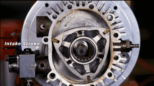 而神一般的转子发动机就不一样了!它利用莱洛三角形顶点和汽缸壁的完美贴合特性,在保证密闭性的同时将汽缸分为了三个独立空间,三个空间同时分别完成进气、压缩、做功、排气的工作。
