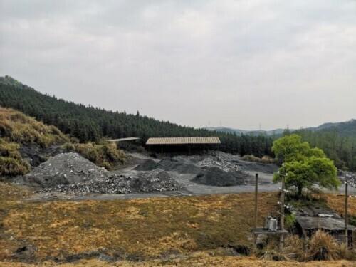 江西省宁都县青塘镇赤水村,远远望去一片郁郁葱葱。坐车经过十几分钟陡峭的山路,在半山腰和接近山顶的地方,原本青翠的林地中突然出现两块大面积的“秃斑”。总共100余亩、超过10个足球场的空地上,堆满了深灰色的尾矿砂。运输过程中扬散的尾矿砂,随雨水流淌到各处,道路被尾矿砂所覆盖,和周围的一片绿色格格不入。