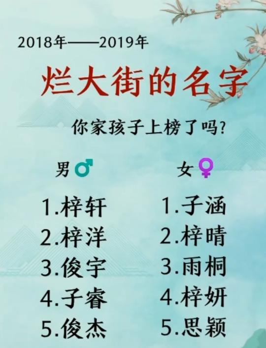 在这几年里 ,子轩、紫萱、子怡、浩轩 、诺一 、梓涵等名字非常的流行 ,命中率也特别的高 。但是,太多人叫这样的名字真的好吗 ?在幼儿园一个班上就有好几个同名 ,老师还要分大小来叫 。那以后工作了呢 ?或者又刚好住在同一个小区呢 ?其实名字叫的人多了 ,也就没有那么好听了 。