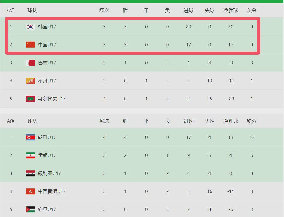 2025年U17亚洲杯预选赛倒数第2轮的比赛,已经全部结束,中国U17国足在对阵马尔代夫的比赛中,打出了精彩的表现,以9-0的比分战胜对手,取得了3连胜。不过随后进行的比赛中,韩国队2-0击败了巴林队,韩国队凭借着3个净胜球的优势,暂时排名小组第1位,中国队排名第2位。
