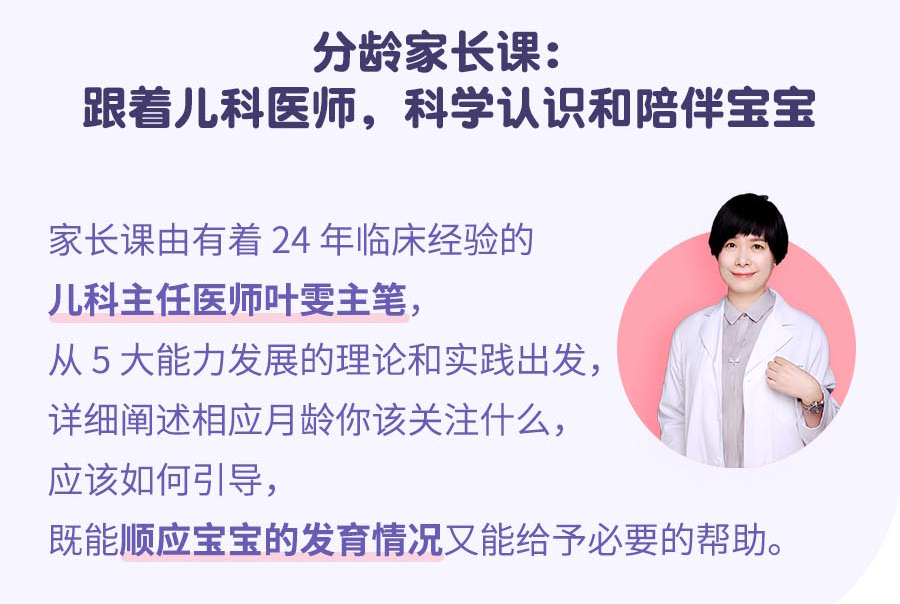 跟市面上很多课程内容不同,丁香妈妈的《0~3 岁全能力发展攻略》课程采用医教结合的方式,邀请了从医 24 年的儿科主任医师叶雯医生,撰写了分月龄家长课,让家长更全面地了解每个月龄宝宝的发育重点和引导方法。