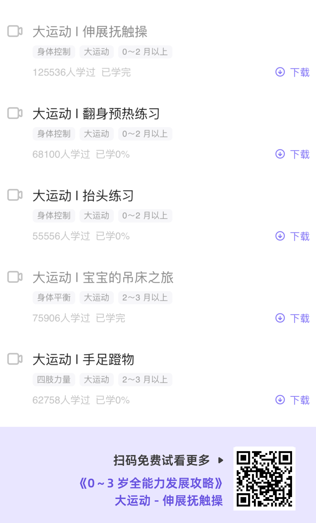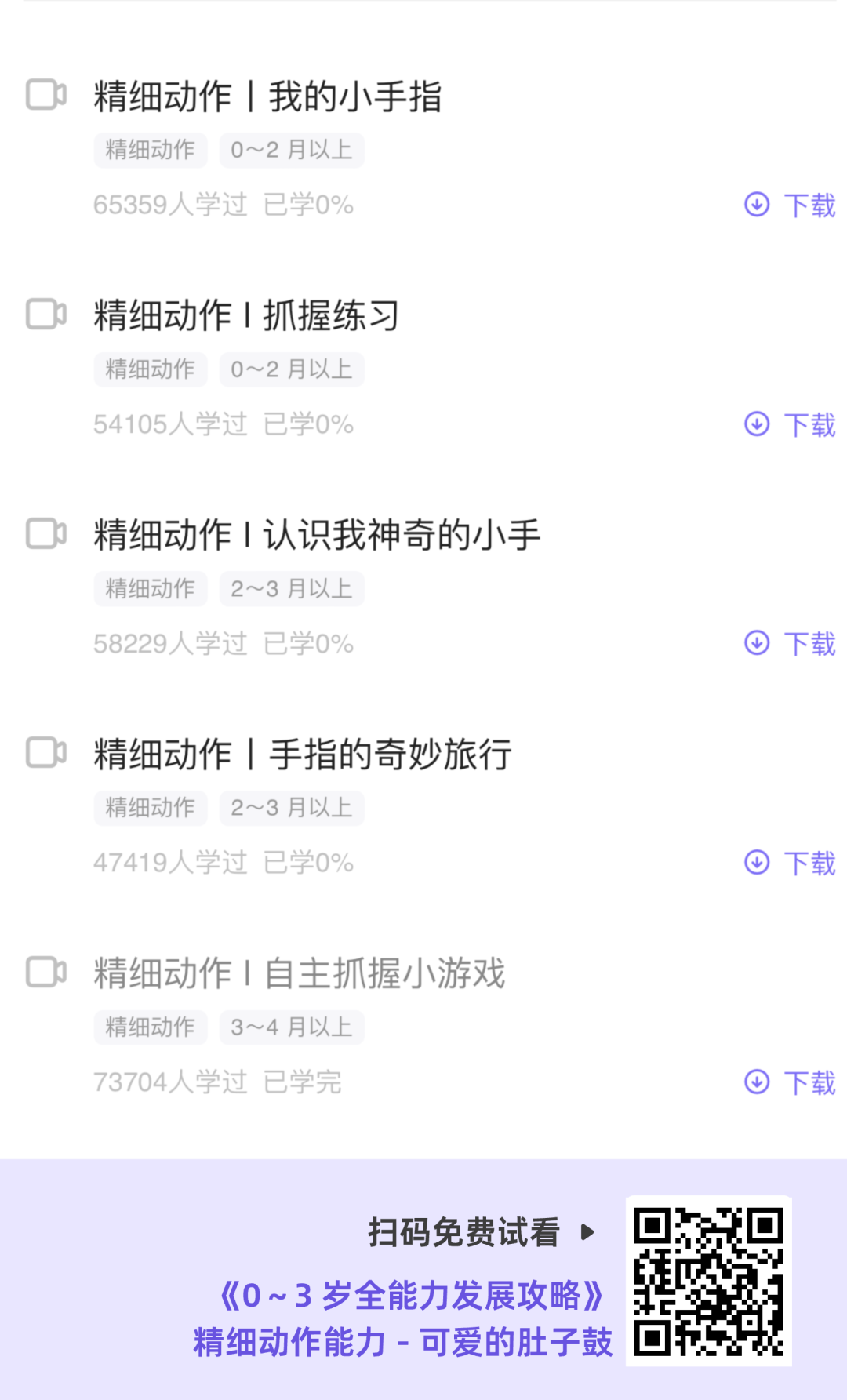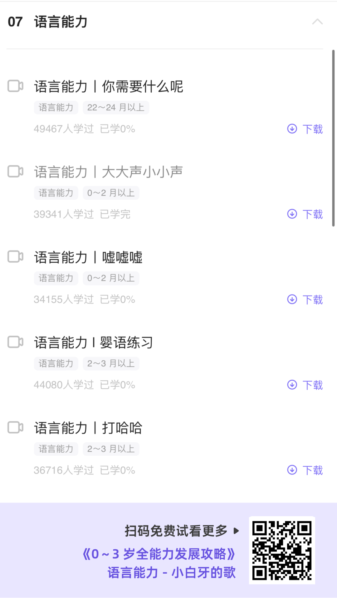 《0~3 岁全能力发展攻略》课程中除了我们前面介绍的精细动作、大运动和语言能力的游戏,还包括认知能力、社会行为,共 5 大能力项,足足 445 节视频课,游戏还提供拓展玩法,既帮助宝宝提升了各项能力,还能增加亲子关系,推荐你现在就扫码加入课程吧。