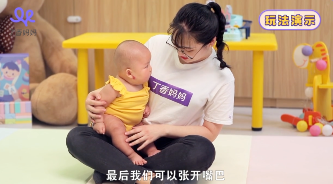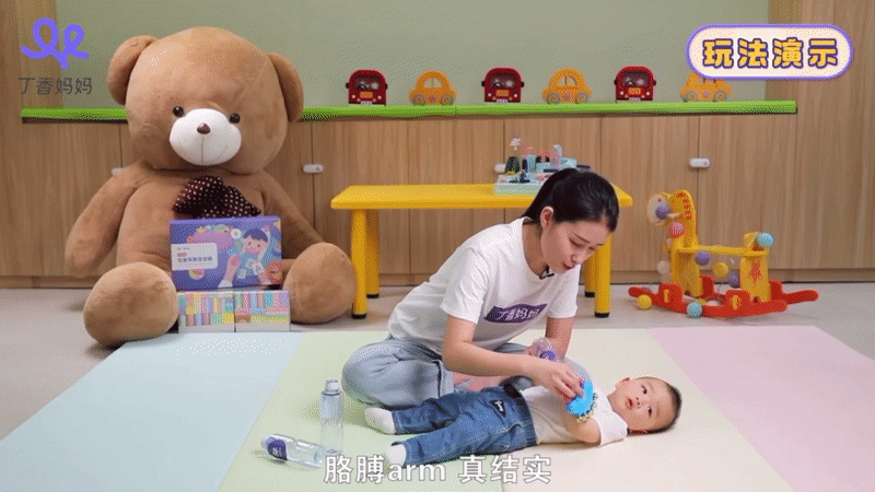 拿 6 月龄的精细动作课程「可爱的肚子鼓」游戏来举例,你可以先带着宝宝边唱童谣、边用手摇铃跟宝宝互动,宝宝会觉得很有趣,充分调动宝宝兴趣。