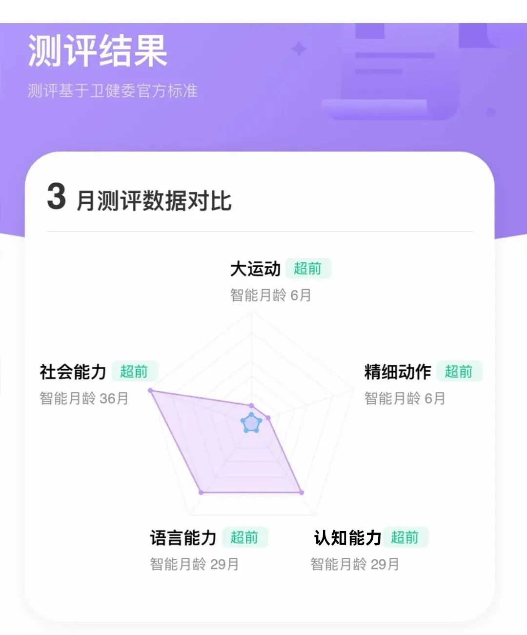 分月龄体现在每个阶段都可以看到宝宝能力的提升和成长,课程会定期推送1 岁前每月可以测评一次,1 岁后每 3 个月做一次;每次测评又涵盖了宝宝 5 大能力项,帮助家长了解宝宝是不是在各项能力均衡提升。