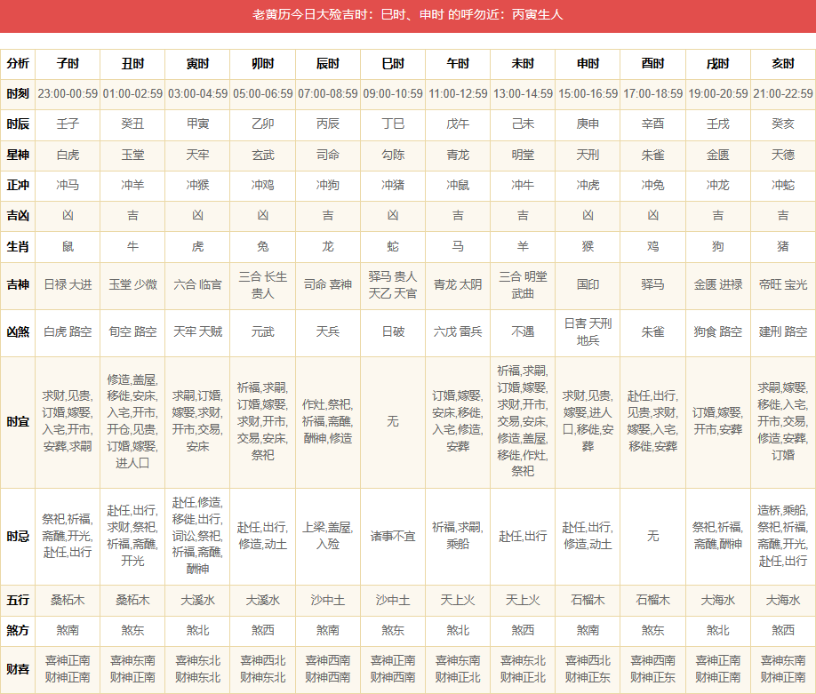 凶煞宜忌:游祸,天贼,重日。虽然今天有一些凶煞出没,但只要保持警惕,避免冒险和盲目行动,就能化险为夷。