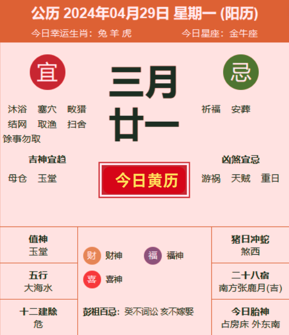 在这个春意盎然的日子里,我们迎来了农历2024年甲辰龙年三月廿一。这一天,不仅标志着季节的更替,也寓意着新的希望和开始。接下来,就让我们从黄历的角度,一起探讨这一天的运势如何,为你的决策提供一些有趣的参考。